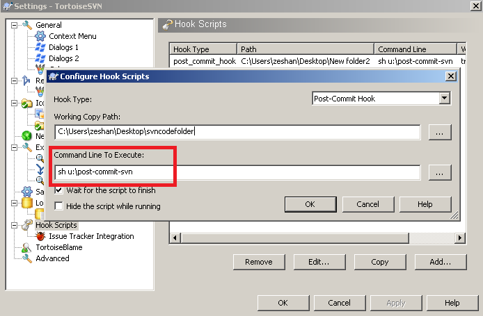- Add hook path into Tortoise SVN client for detail see Client Side Hook Scripts